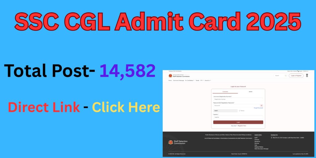 The Staff Selection Commission (SSC) has released the Admit Card for the SSC Combined Graduate Level (CGL) Tier-I Examination 2025 on its official website. The examination is scheduled to be held on 12th, 13th, 14th, 15th, 16th, 17th, 18th, 19th, 20th, 21st, 22nd, 23rd, 24th, 25th & 26th September 2025. The last date to submit the online application form was 05 July 2025. Candidates can download their Admit Card by logging in with their Enrollment Number, Registration Number, or Date of Birth.